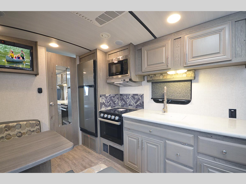 Sleeps 3 Length 23 ft 10 in Ext Width 8 ft 6 in Ext Height 11 ft 4 in Interior Color Moonstone, Carbon Hitch Weight 599 lbs GVWR 7500 lbs Dry Weight 5535 lbs Cargo Capacity 1965 lbs Fresh Water Capacity 50 gals Grey Water Capacity 42 gals Black Water Capacity 35 gals Tire Size ST225/75R15E Furnace BTU 25000 btu Available Beds RV Queen Refrigerator Type 12V Refrigerator Size 10 cu ft Cooktop Burners 3 Number of Awnings 1 Axle Weight 4936 lbs LP Tank Capacity 30 Water Heater Capacity 10 gal Water Heater Type DSI Gas/Electric Quick Recovery AC BTU 13500 btu TV Info LR 28" 12V LED TV Awning Info 12V LED w/Adjustable Pitch Axle Count 2 Number of LP Tanks 2 Shower Type Standard Electrical Service 30 amp Similar Floorplans
