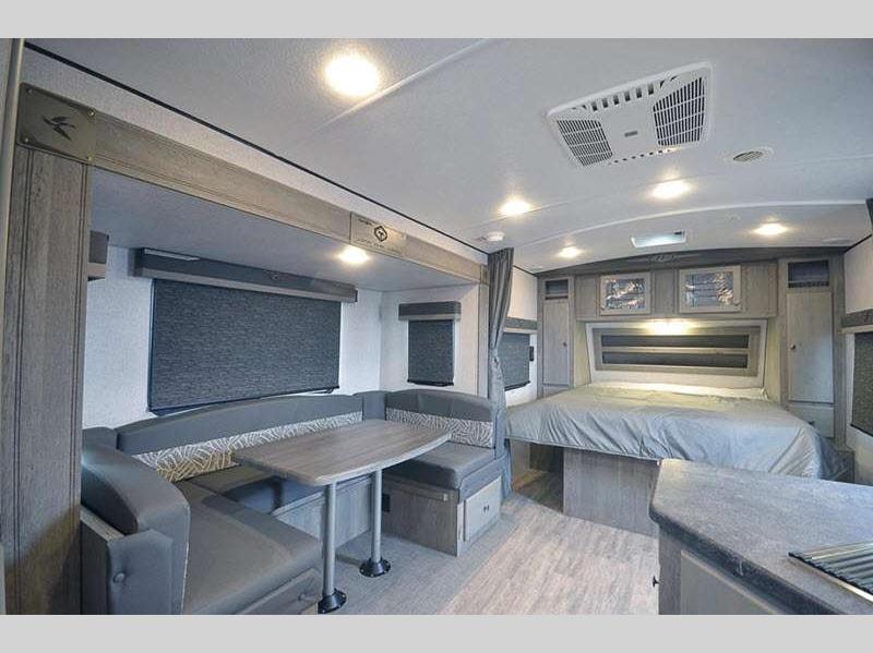 Sleeps 4 Slides 1 Length 22 ft 11 in Ext Width 8 ft Ext Height 11 ft 6 in Interior Color Desert Palms, Solitaire Azul Hitch Weight 556 lbs GVWR 7400 lbs Dry Weight 5662 lbs Cargo Capacity 1738 lbs Fresh Water Capacity 50 gals Grey Water Capacity 42 gals Black Water Capacity 35 gals Tire Size ST235/80R16 Furnace BTU 25000 btu Available Beds Murphy Refrigerator Type 12V Refrigerator Size 10 cu ft Cooktop Burners 3 Number of Awnings 1 Axle Weight 5106 lbs LP Tank Capacity 60 lbs Water Heater Capacity 10 gal Water Heater Type DSI Gas/Electric Quick Recovery AC BTU 13500 btu Awning Info 14' 6" 12V LED w/Adjustable Pitch Axle Count 2 Shower Type Tub/Shower Combo Solar Wattage 400 watts Similar Floorplans