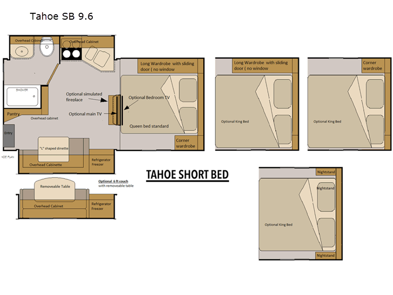 This truck camper is perfect for your short bed truck. There is a rear entry for great views when exiting the camper, an L-shaped dinette to dine at which also offers extra sleeping space for your kids or friends, and a galley kitchen is located on the opposite side allowing you to cook while away. You will enjoy the queen bed all to yourselves and can even add an optional TV if you like to watch movies in bed. And the full bathroom gives you privacy when changing and getting cleaned up. There are options to choose from to enhance this already amazing camper such as adding an optional fireplace or choosing a king bed in place of the queen bed.